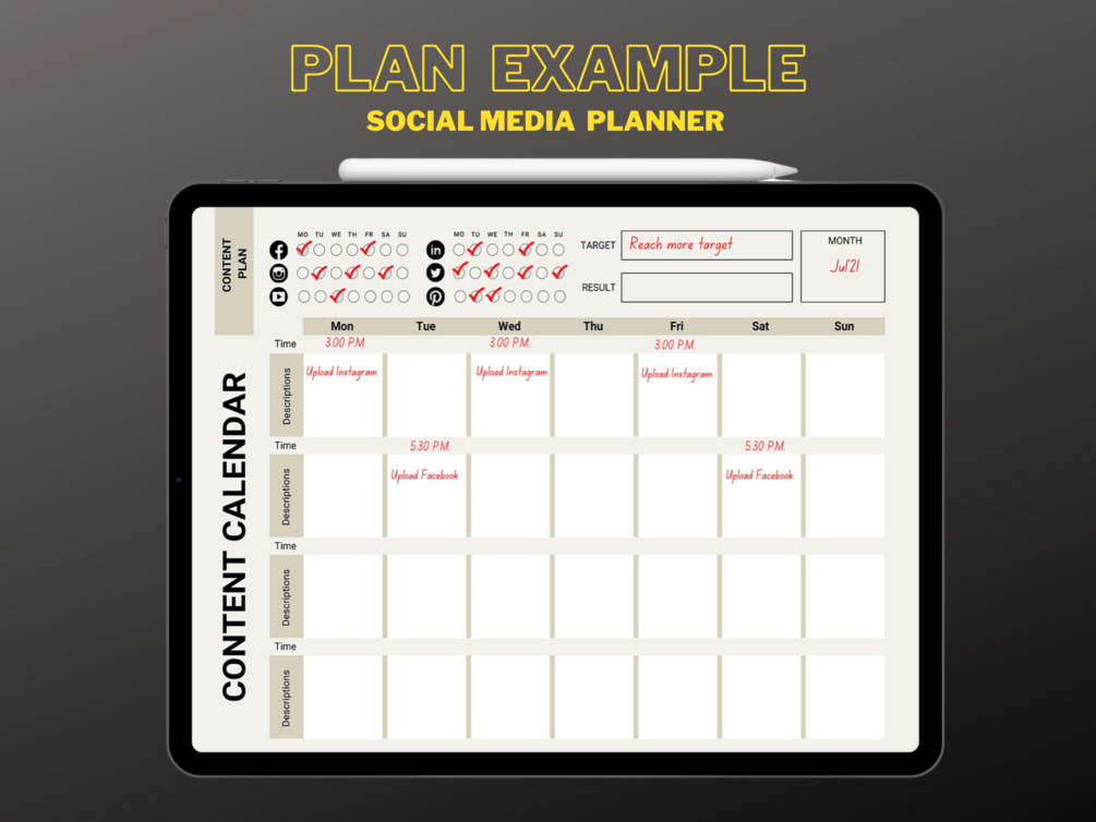 This Social Media Planner Template contains plans for Instagram, Facebook, Twitter, Pinterest, YouTube and LinkedIn. It's easy to use, just write down when you're going to plan to work on it and upload to your social media consistently. When you do this, the date is not important anymore because it's better to do it on your plan day.